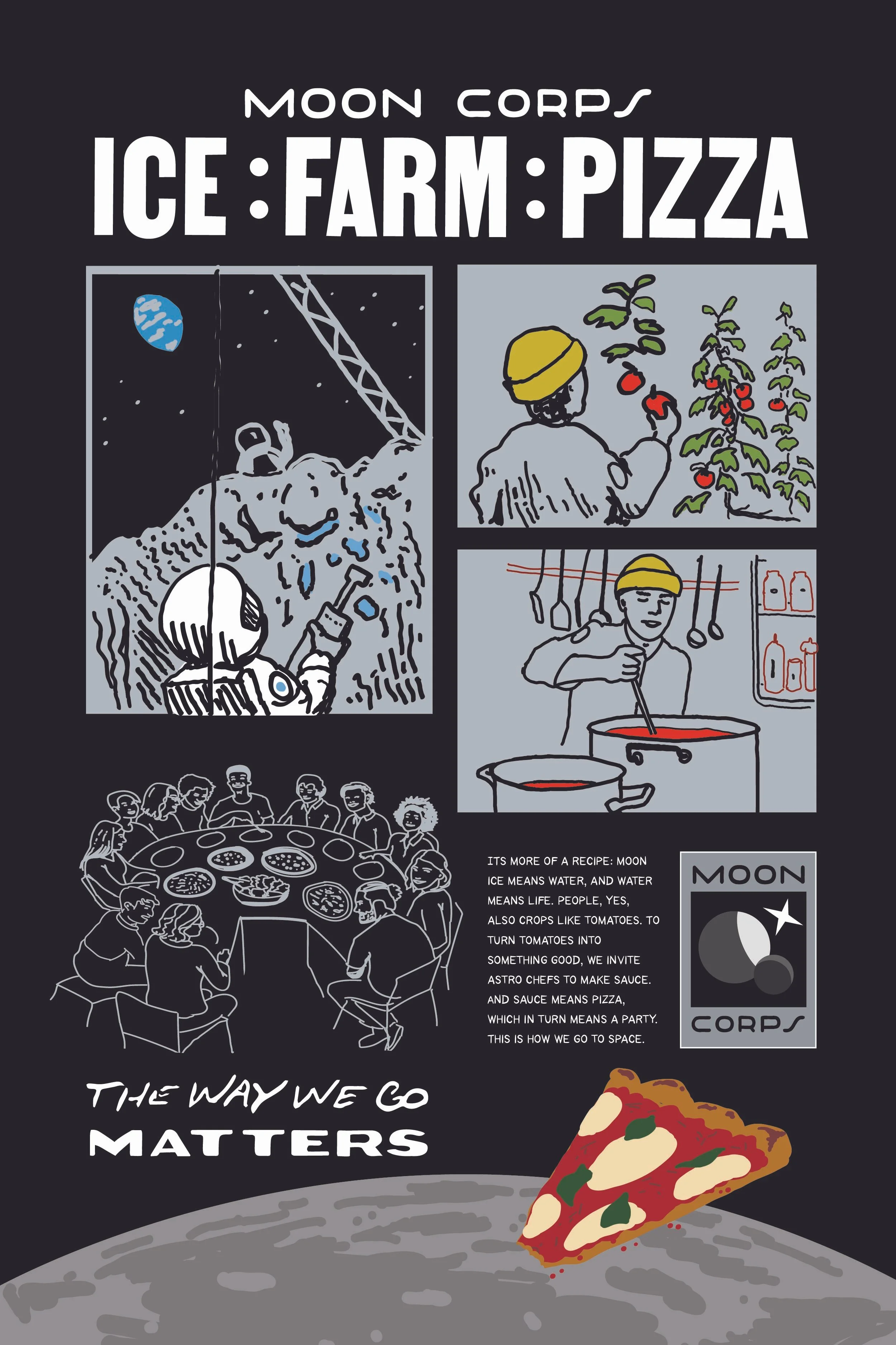 There’s water ice that needs mined, there’s a farm that needs tended to, there’s a dinner to make. Doing ordinary work in an extraordinary place is just part of the deal. Our international program believes that the way we go matters. To us, humans are our focus, and humans can’t go far without water, fresh food and the ability to sit down with a community. We aim to bring space workers together and keep them nourished. You can be part of that. Join the Moon Corps!